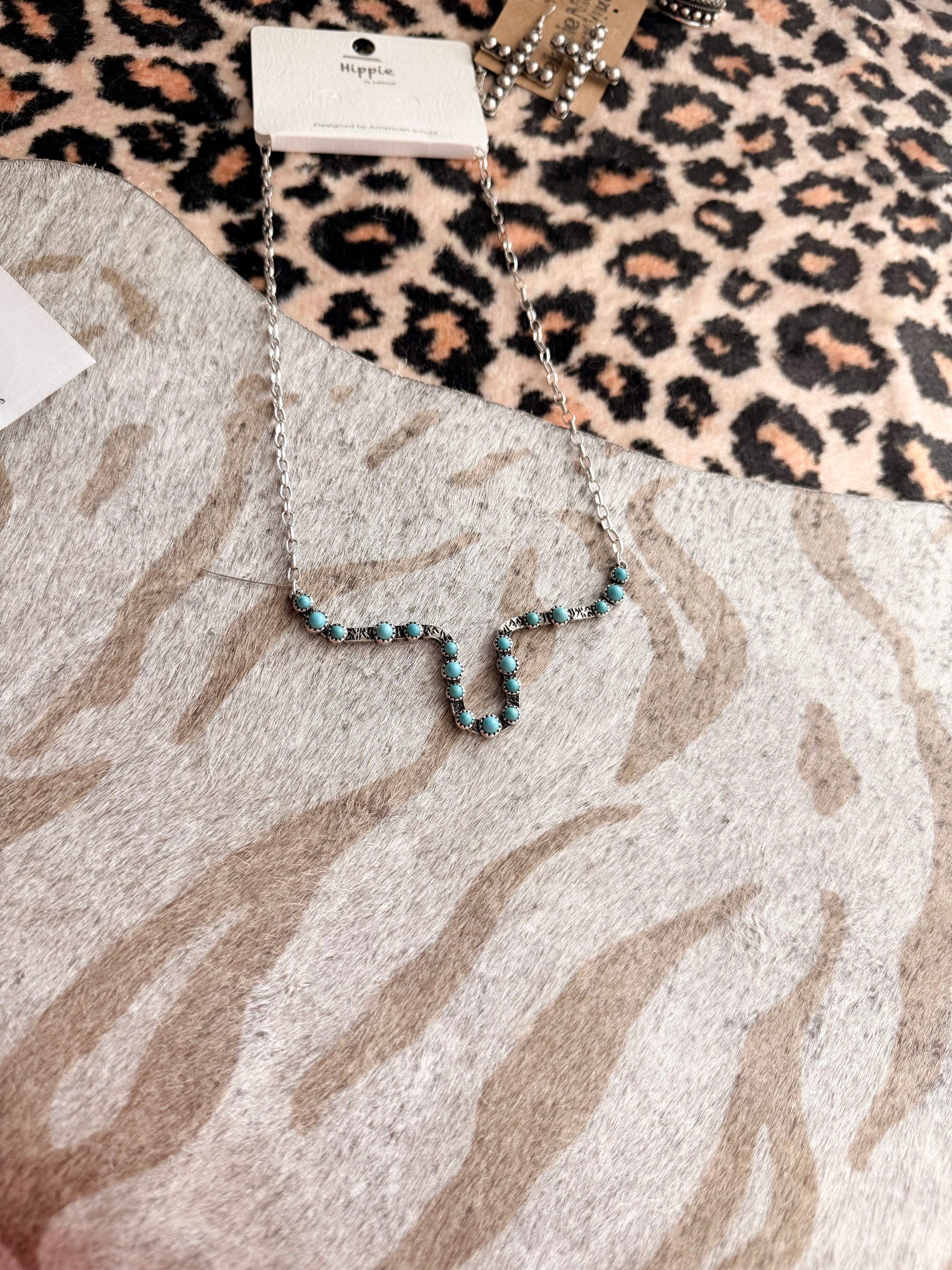 A western classic with a pop of color. The Turquoise Longhorn Necklace features a bold longhorn design accented with turquoise, bringing effortless western charm to your everyday look. Designed at 18 inches, it sits perfectly whether worn solo or layered into your favorite stack.